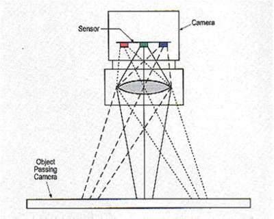 (2)3Line彩色工业相机,该相机的具有R、G、B三行像元,分别对红、绿、兰三种波长的光敏感,所以每个像素点都会对应R、G、B三个通道的数值,形成彩色的图像数据。需要注意的是,由于R、G、B三行像元在同一时刻所采集的并非同一位置的信息(见图),在实际应用中需要进行运动校正才能得到所需的彩色图像。一般的工业相机都提供内部进行运动校正处理的功能,但对于对比度非常高的图像边缘还是容易出现色彩失真的现象。